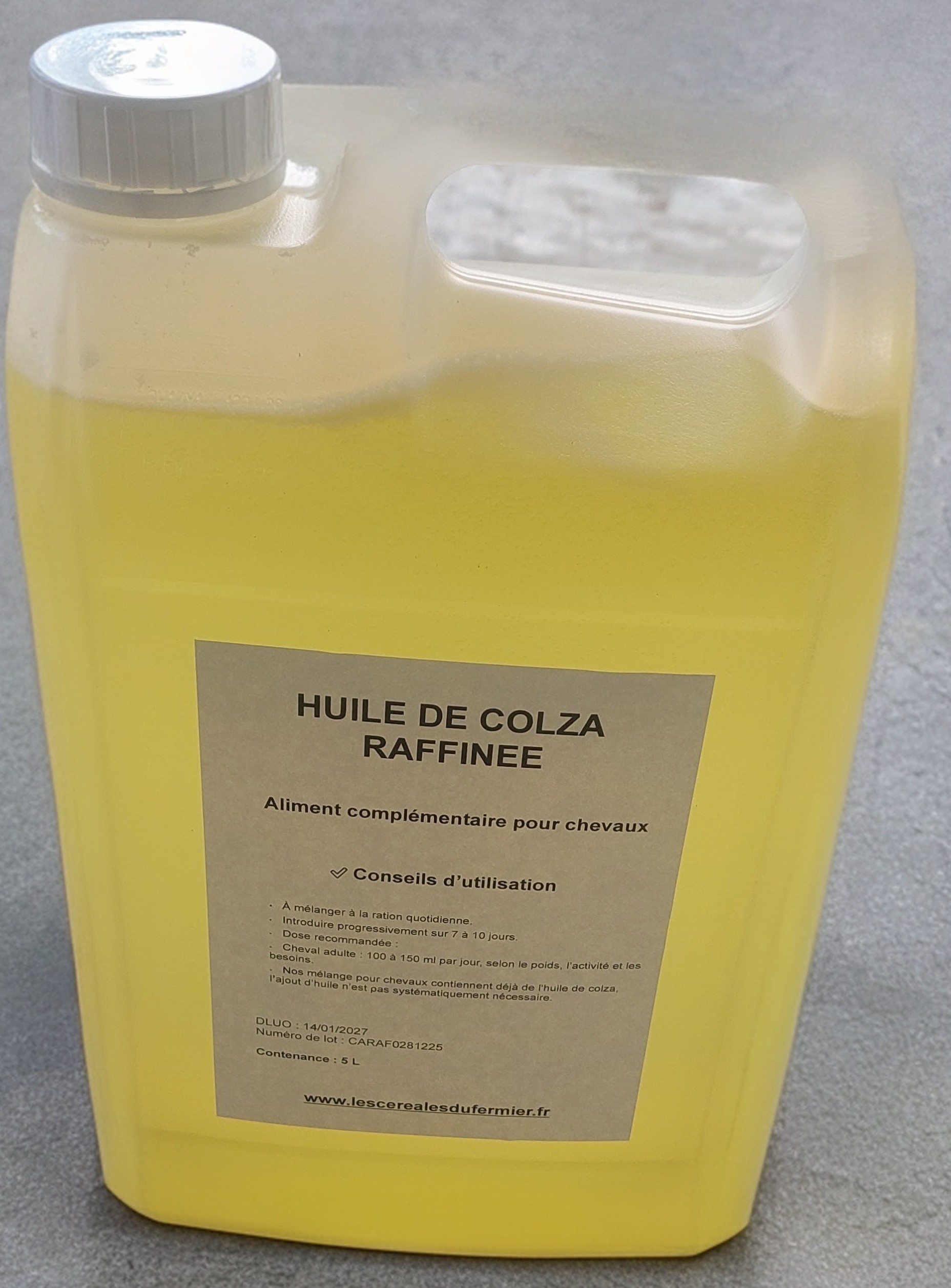 Description : Huile de colza raffinée de haute qualité, riche en oméga‑3 et oméga‑6, idéale pour énergie, brillance du poil et santé générale de votre cheval.